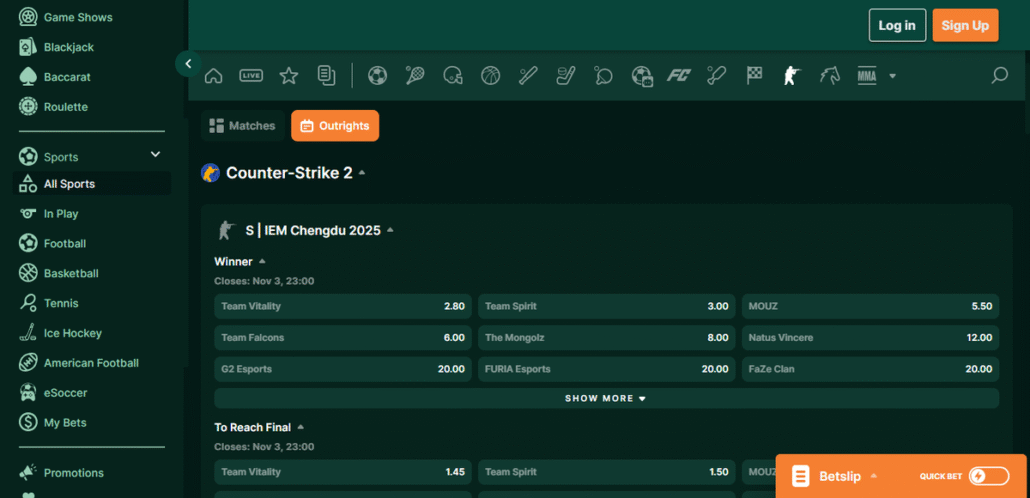 Esporto lažybos: esports yra viena iš svarbiausių TG.Casino sričių. Pateikiami tokie žaidimai kaip Counter‑Strike, League of Legends, Dota 2, Valorant ir kiti. Lažybos apima tiek varžybas prieš rungtynes, tiek live lažybos vykstant žaidimui.