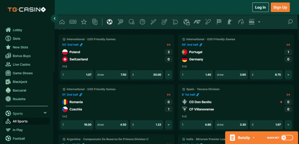 Sportų įvairovė: TG.Casino siūlo lažybas daugiau nei 30 skirtingų sporto šakų. Tai apima populiariausias sporto rūšis – futbolą, krepšinį, tenisą, ledo ritulį, kriketą – bet taip pat ir mažiau įprastas, pvz., virtualų sportą, kovų sportus (MMA, boksas), arklių lenktynes ar net smulkesnius čempionatus, priklauso nuo regiono.