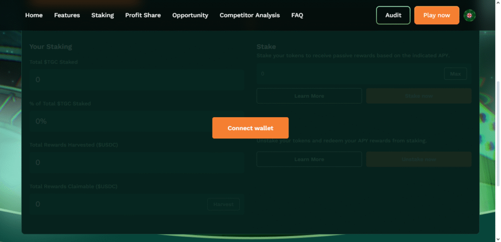 Be klasikinių kazino žaidimų, tokių kaip ruletė, „blackjack“, „dice“ ar lošimo automatai, TG.Casino siūlo integruotą stakingo (žetonų laikymo už atlygį) sistemą. Turėdami ir laikydami $TGC žetonus, vartotojai gali gauti pasyvių pajamų iš visos platformos veiklos. Kitaip tariant, lojalūs bendruomenės nariai, gaudami pajamų iš pačios platformos, yra skatinami tapti daliniais platformos „savininkais“.