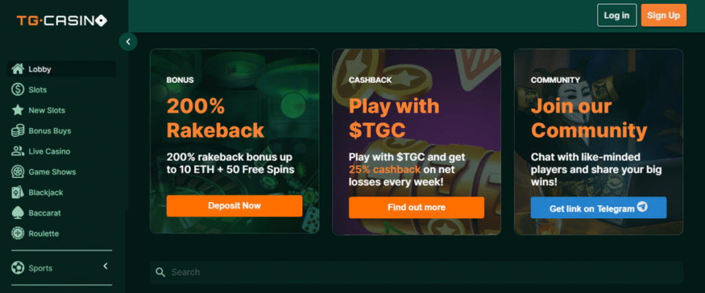TG.Casino leidžia vartotojams žaisti įvairius kazino žaidimus naudojant skaitmenines valiutas, tokias kaip Ethereum (ETH), Bitcoin (BTC), USDT ir kitus populiarius žetonus, įskaitant ir platformos vietinę kriptovaliutą – $TGC tokeną.