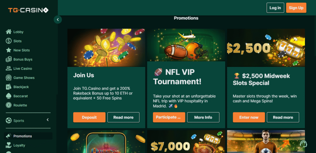 TG.Casino rengia įvairias sezonines akcijas ar turnyrus. Pavyzdžiui, futbolo sezonų turnyrai su prizų fondais. Yra pasiūlymų su kombinuotais statymais, kuriuose vartotojai gali gauti papildomą priedą priklausomai nuo pasirinkimų kiekio.
