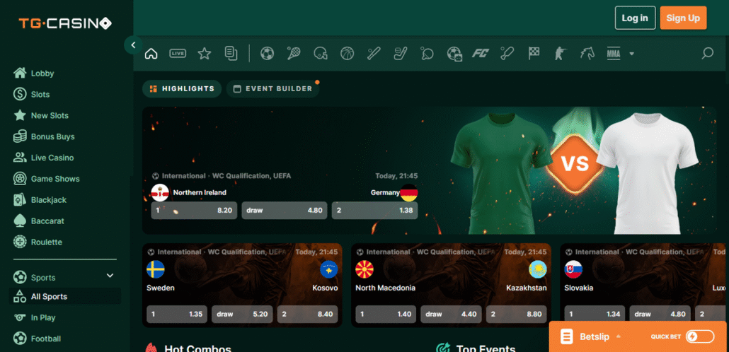 TG.Casino neapsiriboja vien kazino lošimais. Platforma turi ir gana išvystytą sporto lažybų (sportsbook) skyrių, kuris suteikia galimybę lažintis ne tik prieš rungtynes (pre‑match), bet ir vykstant žaidimui (live/in‑play), taip pat naudotis įvairiomis lažybų rinkomis bei pasiūlymais.